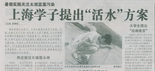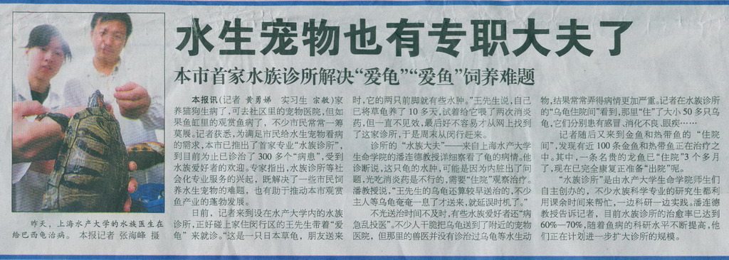 9月3日,解放日报在要闻版以“水生宠物也有专职大夫”为题对我校水族诊所进行了报道。水族诊所是由生命学院师生们自主创办的,自建立以来,已为300多个水族“病患”进行了诊治,深受水族爱好者的欢迎。水族诊所的创办既解决了市民饲养水生宠物的难题,推动了本市观赏鱼的发展,同时也为我校水族专业学生科研实习提供了有益的平台,实现了学校与社会的“双赢”。进入9月,高校暑期社会活动已渐入尾声,9月2日,新闻晚报以“上海学子提出'活水'方案”为题,对我校生命学院学生开展的“太湖蓝藻”污染调查进行了图文报道,为我校暑期社会实践宣传报道工作划上了一个圆满句号。