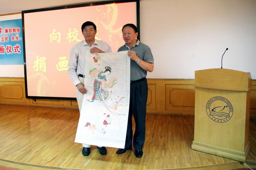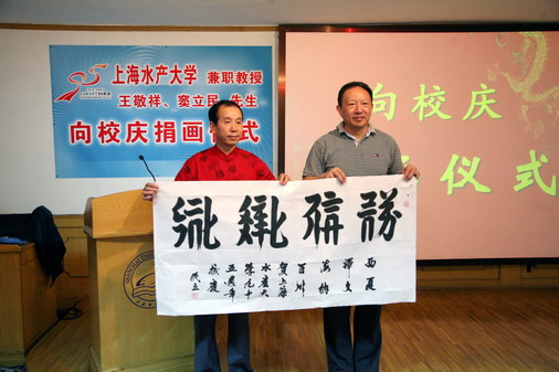 校党委书记叶骏发表讲话,对王敬祥先生、窦民立先生向上海水产大学赠画深表感谢,同时指出学校工作离不开社会各界的支持,两位书画家应聘我校兼职教授填补了我校在书画教育上的空白,希望两位书画家能为我校艺术教育培养更多的人才。