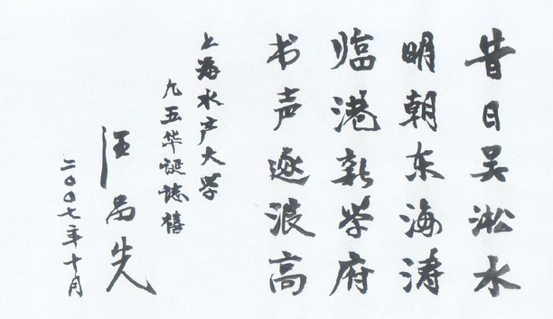 近日,我国著名海洋地质学家、中国科学院院士、同济大学教授汪品先为我校校庆题词:“昔日吴淞水,明朝东海涛,临港新学府,书声逐浪高”,对我校95周年校庆表示祝贺。