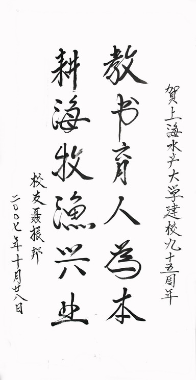 近日,国家粮食局党组书记、局长,我校1977届海洋捕捞专业聂振邦校友为我校校庆题词:“教书育人为本,耕海牧渔兴业”,祝贺母校建校九十五周年。
