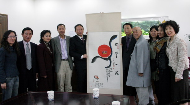 此次韩国国际水产亲善交流协会向学校赠送的画作,为韩国著名僧人画家文殊眼长老为我校95周年校庆专门创作的。此前,为确定校庆画作的主题及内容等事宜,权宁灿会长一行曾于今年9月来校进行了访问。