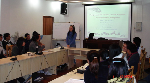 12月8日美国缅因大学张毓颖博士为我校研究生做了“The dynamics of American Lobster ecosystem & American Lobster management”的报告,正式启动了我校与美国缅因大学研究生的学术交流。2006年,我校特聘教授陈勇博士与海洋学院和研究生部达成意向,每年互派研究生,开展中美研究生学术交流与合作。