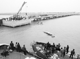 昨天下午搁浅鲸被拖拽至长兴岛码头张龙