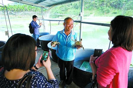 苗栗县钟福贵向游客介绍自家养的大闸蟹(2015年11月17日摄)。新华社发