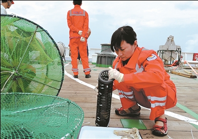 8月23日,许强华教授在“张謇”号上查看诱捕笼。