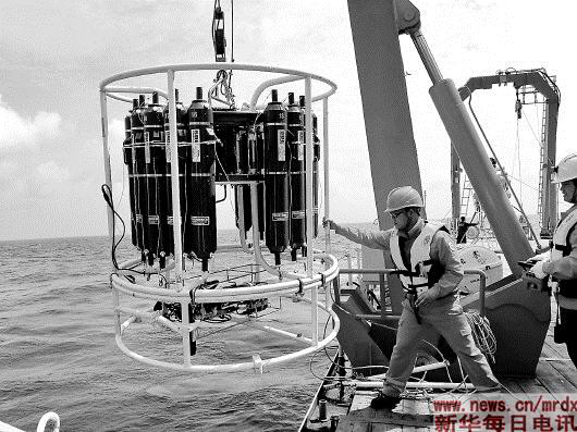 两个原位保压采水设备,通过“张謇”号科考船,被放至6700多米深的深海作业站位