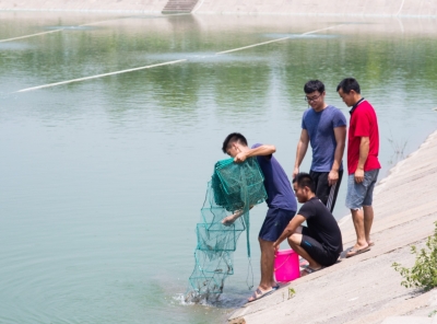 陈绍坚(左)和同伴们在虾塘边捕虾。实习生殷方成/摄