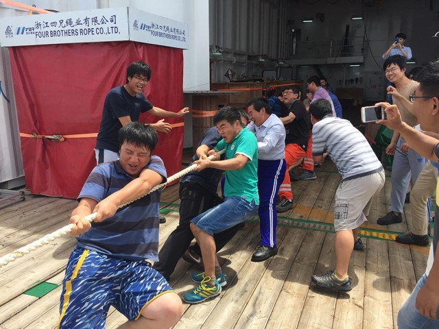 没有在城市中丰富的休闲选择,队员们依旧玩得尽兴:乒乓球、拔河、象棋、三打一等项目场场爆满。26日中午,完成日常科考作业后,“张謇”号开到了离岸较近的有信号处,船员们开始用微信与亲朋好友们联系。除夕夜,各项比赛进入了决赛,自制“春晚”同时对先进人员和比赛冠亚军进行表彰和奖励。船员缪海建曾在漆黑的夜晚需要船员下海去抢救无人潜水器时挺身而出,晚会上他的一句“我是南通人,我在张謇号上,彩虹鱼项目是我们南通人发起的”,赢得阵阵掌声。
