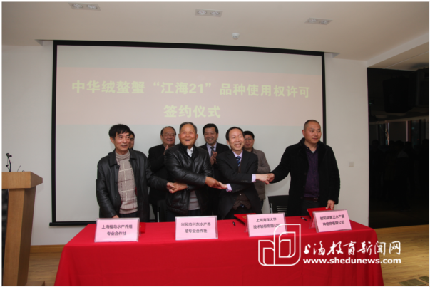 本次签约仪式上,共有三家企业获得授权。其中江苏省射阳县黄三水产苗种培育有限公司获得技术支持,指导企业育“江海21”的蟹苗,销往全国;上海福岛水产养殖专业合作社、江苏省兴化市兴东水产养殖专业合作社养殖“江海21”蟹苗到扣蟹,扣蟹销往全国。