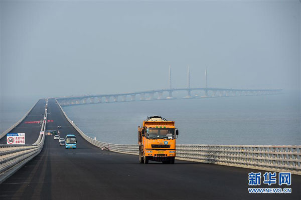 一辆运输沥青的工程车辆行驶在港珠澳大桥桥面上(4月29日摄)。新华社记者刘大伟摄