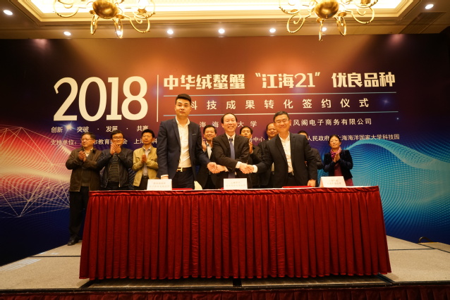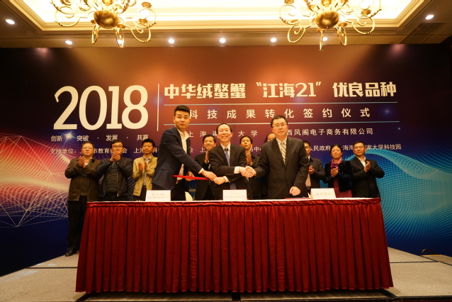 副校长、上海水大技术转移有限公司董事长李延臣与苏州西风阁电子商务有限公司董事长姚远签订了产学研合作协议,上海水大技术转移有限公司总经理吴炯华与苏州西风阁电子商务有限公司总经理权辉、上海农业发展有限公司董事长祝逸明签订了“江海21”品种转让合同,吴炯华还与权辉,开云kaiyun登录入口教授、“江海21”育种技术路线制定者和实施者王成辉签订了共建“蟹太太”养殖研发中心合作协议。