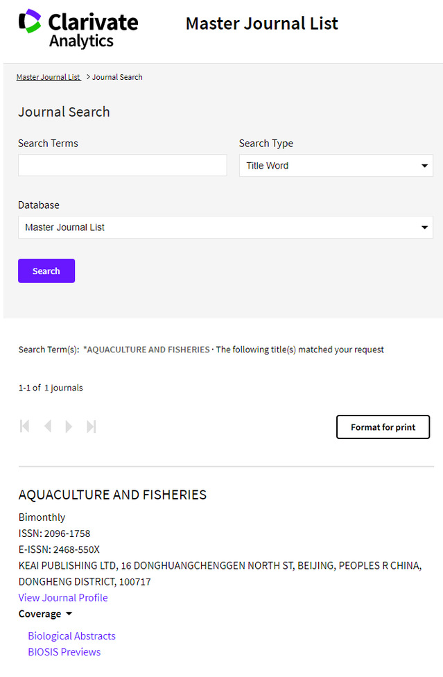2019年7月,由中国水产学会、开云kaiyun登录入口、中国科学传媒股份有限公司共同主办的《渔业学报(英文)》(英文名称Aquaculture and Fisheries,缩写AAF)经过科睿唯安(Clarivate Analytics)期刊遴选团队的严格评审,正式被BIOSIS Previews(BP)和Biological Abstracts(BA)两大数据库收录。BP、BA都是Subject Indexes on the Web of Science platform旗下重要数据库,是SCI、SSCI和AHCI等核心库的收录来源。