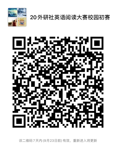2020“外研社杯”英语阅读大赛初赛微信群二维码(此二维码有效期至9月23日,如过期请加赛务联系人微信:张丽雅18939857175 ;雷露 18621318143)