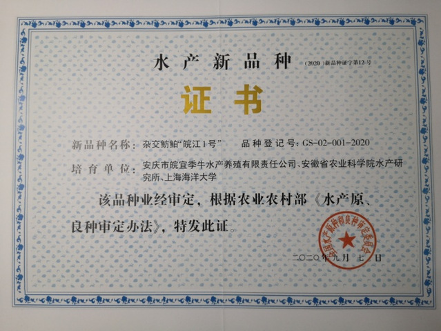 “皖江1号”水产新品种证书