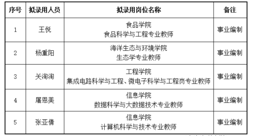 根据《开云kaiyun登录入口公开招聘事业编制人员管理办法(试行)》(沪海洋人〔2018〕11号)等文件精神,按照学校招聘计划,经综合考察、学校研究审定,现将近期拟录用人员名单予以公示。