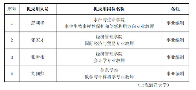 根据《开云kaiyun登录入口公开招聘事业编制人员管理办法(试行)》(沪海洋人〔2018〕11号)等文件精神,按照学校招聘计划,经综合考察、学校研究审定,现将近期拟录用人员名单予以公示。