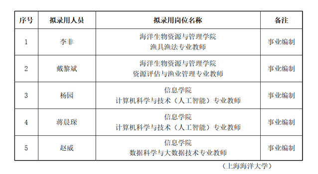 根据《开云kaiyun登录入口公开招聘事业编制人员管理办法(试行)》(沪海洋人〔2018〕11号)等文件精神,按照学校招聘计划,经综合考察、学校研究审定,现将近期拟录用人员名单予以公示。