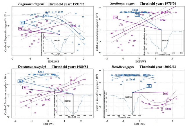 论文2“Nonstationary response of commercially pelagic species in the Humboldt current ecosystem to climate variability”基于物种资源与气候和环境间变化关系具有与时间相关的非平稳性这一科学假设,以东南太平洋中上层重要经济种类秘鲁鳀、南美拟沙丁鱼、智利竹筴鱼和茎柔鱼为例,根据物种产量数据,结合大尺度气候指数和区域海洋环境数据构建阈值模型,识别气候、环境以及物种产量跃变对应关系,论证物种产量变化对气候和环境变化的非稳态响应(图2),此研究结果厘清了东南太平洋重要经济种类对气候变化的非稳态响应,为评估其他大洋性中上层经济物种资源与气候和环境变化关系提供参考。论文第一作者为冯志萍博士后,通讯作者为余为副研究员。