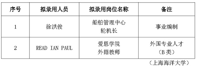 根据《开云kaiyun登录入口公开招聘事业编制人员管理办法(试行)》(沪海洋人〔2018〕11号)和《开云kaiyun登录入口外籍教师管理办法(试行)》(沪海洋人〔2019〕11号)等文件精神,按照学校招聘程序,经综合考察、学校研究审定,现将近期拟录用人员名单予以公示。