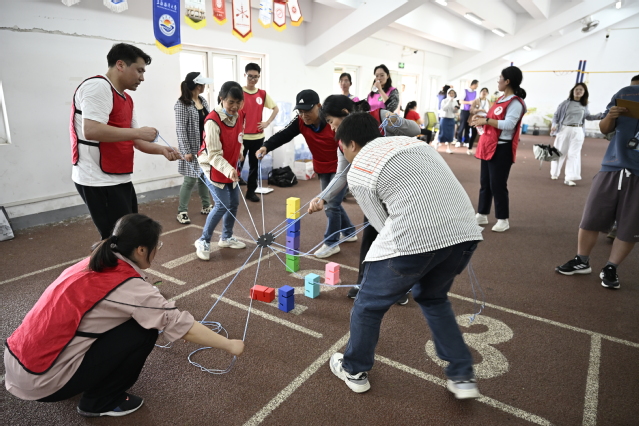 现场,活力四射的学生啦啦操表演精彩登场,出席开幕式的领导和教师们在“九宫格飞盘”体验活动热身后,教职工趣味运动会拉开了帷幕。平日严谨治学的教职工们脱下正装,化身运动健将,在充满趣味的比赛项目中挥洒汗水,展现别样风采。本届趣味运动会保留深受教职工喜爱的团队项目“旱地龙舟”“胸背夹球”,并得到了“浦工乐学”文化配送服务的支持,新增“吸盘射箭”“合力筑塔”两项当前比较流行的团建活动,展现的就是运动员之间的配合和默契,让更多的老师在活动中提高团队协作的意识,增进交流,同时,也达到了锻炼身体的目的。