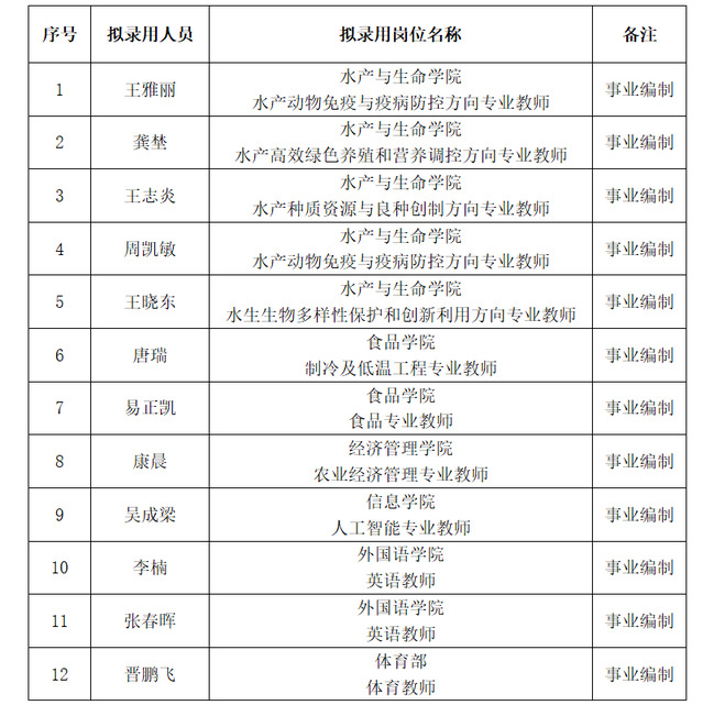 根据《开云kaiyun登录入口公开招聘事业编制人员管理办法(试行)》(沪海洋人〔2018〕11号)等文件精神,按照学校招聘程序,经综合考察、学校研究审定,现将近期拟录用人员名单予以公示。