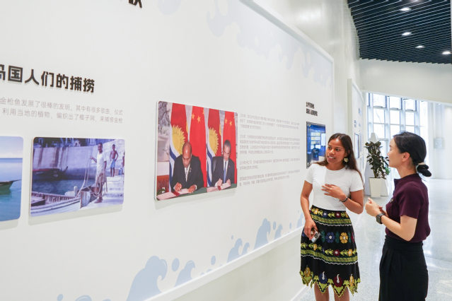 在大洋世家现代化加工车间,实践团实地观摩了金枪鱼自动化分割、冷冻保鲜及精深加工的全流程生产体系。在了解到大洋世家长期与基里巴斯保持密切合作时,来自基里巴斯的留学生Atanimango Karotu(洛棠)动情地表示:“中国长期支持基里巴斯的远洋渔业建设,这种全方位的帮扶让我们真切感受到了兄弟般的情谊。