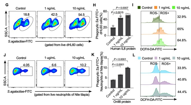 通过功能验证实验,证实IL8蛋白处理可显著增强细胞的抗菌功能。具体而言,经IL8刺激的细胞表现出:(1)显著增强的病原体吞噬能力;(2)活性氧(ROS)生成水平明显提升。该研究在非哺乳动物模型中证实了IFNγ–IL8信号通路的免疫功能保守性,不仅完善了硬骨鱼类应对细菌感染的免疫应答理论框架,更为水产抗病育种和疫病防控提供了重要的分子靶标。作为一体健康(One Health)理念下的典范研究,本成果通过跨物种比较免疫学研究方法,有力推动了鱼类功能基因组学和比较免疫学学科的发展。