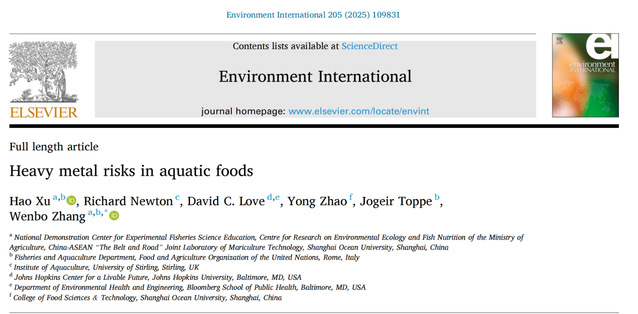 近日,我校联合国粮农组织(FAO)实习生、水产与生命学院硕士生徐昊与FAO渔业及水产养殖业司渔业官员Jogeir Toppe、约翰霍普金斯大学、斯特灵大学学者及我校食品学院赵勇教授合作,在环境科学领域顶级期刊Environment International(中科院一区 TOP,影响因子 9.7)发表题为Heavy metal risks in aquatic foods的研究型论文。该研究创新性地在全球、国家和消费者三个维度量化水产品重金属危害与风险,并结合水产品消费收益进行对比分析,最终明确全球层面水产品消费安全限值远高于当前全球平均消费量,为推动水产品可持续消费提供了关键理论支撑与数据依据。论文以开云kaiyun登录入口为第一单位,水产与生命学院张文博副教授担任通讯作者。