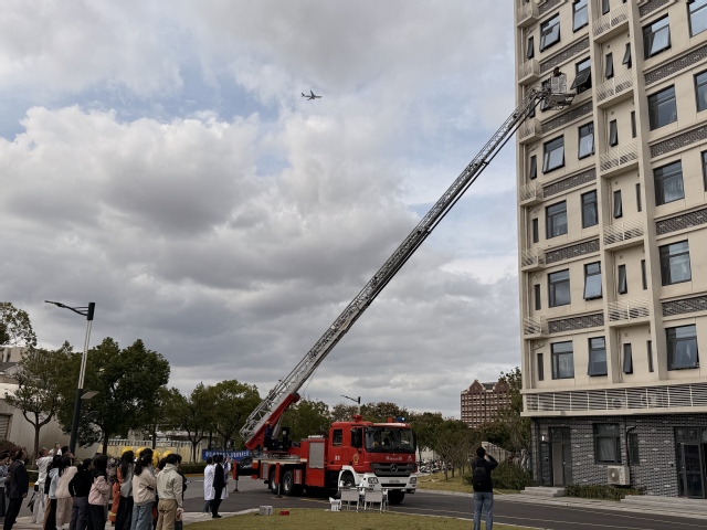 活动现场进行了火灾逃生演习、低楼层消防梯救援及高空云梯救援演练。师生员工们通过消防安全逃生演练,零距离体验火灾发生时该如何疏散、自救。消防员为大家科普常用消防器材的操作方法、使用场景等相关知识,现场气氛热烈,师生们踊跃参与,积极互动。
