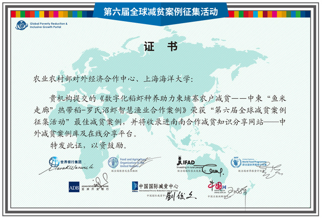 “全球减贫案例征集活动”最佳减贫案例是全球减贫与乡村发展领域极具影响力的国际奖项。第六届活动自2024年10月启动以来,吸引了40个国家和地区的840篇案例参与申报,经7家发起机构共同评审。我校在柬工作从全球众多案例中脱颖而出,展示了我校在全球减贫事业中的责任担当,也进一步扩大了我校水产养殖技术、水产养殖装备与数字化技术在全球特别是东南亚的影响力。