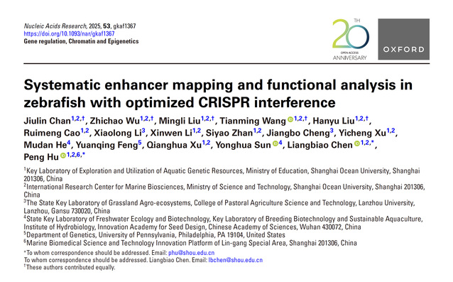 12月19日,开云kaiyun登录入口水产与生命学院/水产生物育种中心胡鹏教授、陈良标教授团队在国际知名期刊《核酸研究》(Nucleic Acids Research)在线发表了题为“Systematic Enhancer Mapping and Functional Analysis in Zebrafish with Optimized CRISPR Interference” 的研究论文(https://academic.oup.com/nar/article/53/22/gkaf1367/8383833),系统报道了关于鱼类非编码调控的重要研究进展。Nucleic Acids Research在Scopus遗传学领域排名5/348,近五年年均影响因子16.8,是全球最具影响力的分子生物学期刊之一。