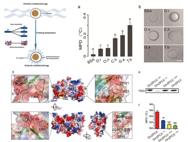 After long-term research, Doctor Cao Lixue and Master Huang Qiao, both visiting scholars of the research team led by Chen Liangbiao, discovered the low temperature-related gene amplification of the AnnotoZPs of Antarctic notothenioids, and obtained ice-melting-promoting (IMP) activity. Some members of AnnotoZPs have the ice-binding activity and the function of non-colligatively reducing the freezing point of solutions; under medium concentration, they can reduce the freezing point of solutions by 0.26-0.65℃. Based on the experiment on transgenic zebrafish, this research proved that the zebrafish eggs expressing heterologous AnnotoZP had a significantly increased survival rate under freezing conditions, and that the zebrafish chorionin solution containing heterologous AnnotoZP protein had an obviously reduced freezing point. This research, based on the mutation analysis on AnnotoZPs, also demonstrated that the ZP structural domains and acidic residues of AnnotoZPs are essential structures for IMP activity, and thus expounded the unique ZP-ice-binding freeze-prevention mechanism of AnnotoZPs and similar proteins and its difference from the freeze-prevention mechanism of known antifreeze proteins.