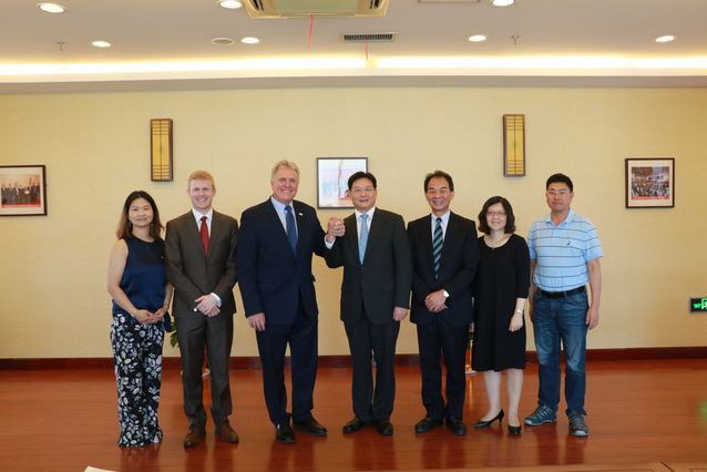 On the afternoon of June 24, SHOU President Cheng Yudong and Director of the International Exchange Office Zhong Junsheng met with the delegation of the University of Wisconsin-Stout at the meeting room on the 12th floor of Tuwen Information Center. The delegation was composed of Robert Meyer, President of the University of Wisconsin-Stout; Scott Pierson, Director of the International Cooperation Office; and Min DeGruson, Associate Professor of the Engineering Technology Department.