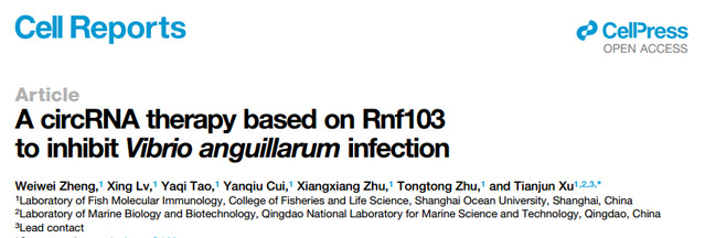 Recently, Professor Xu Tianjun’s Team at SHOU has made new progress in research on the treatment of Vibrio anguillarum infection in fish with a circRNA therapy. The research results have been published in Cell Reports, a sub-journal of Cell, titled “A circRNA therapy based on Rnf103 to inhibit Vibrio anguillarum infection”. Zheng Weiwei, a Doctoral candidate of SHOU, is the first author of the paper, and Professor Xu Tianjun is the corresponding author.