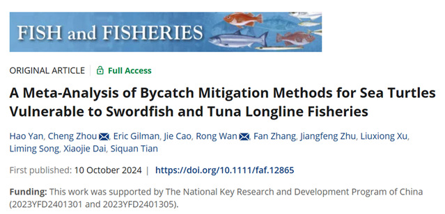 Recently, Prof. Wan Rong's group at Shanghai Ocean University, in collaboration with researchers from Hawaii Pacific University, North Carolina State University, and the Pelagic Fisheries Sci-Tech Innovation Team, has made new progress in revealing the effectiveness of bycatch mitigation methods for sea turtles, which was published in the top fisheries journal, the Fish and Fisheries under the title of A meta-analysis of bycatch mitigation methods for sea turtles vulnerable to swordfish and tunalongline fisheries (doi: 1011/faf.12865), with Yan Hao, a master student of Shanghai Ocean University (Class 2023) as the first author of the paper, and Prof. Wan Rong and Associate Prof. Zhou Cheng as the co-corresponding authors.